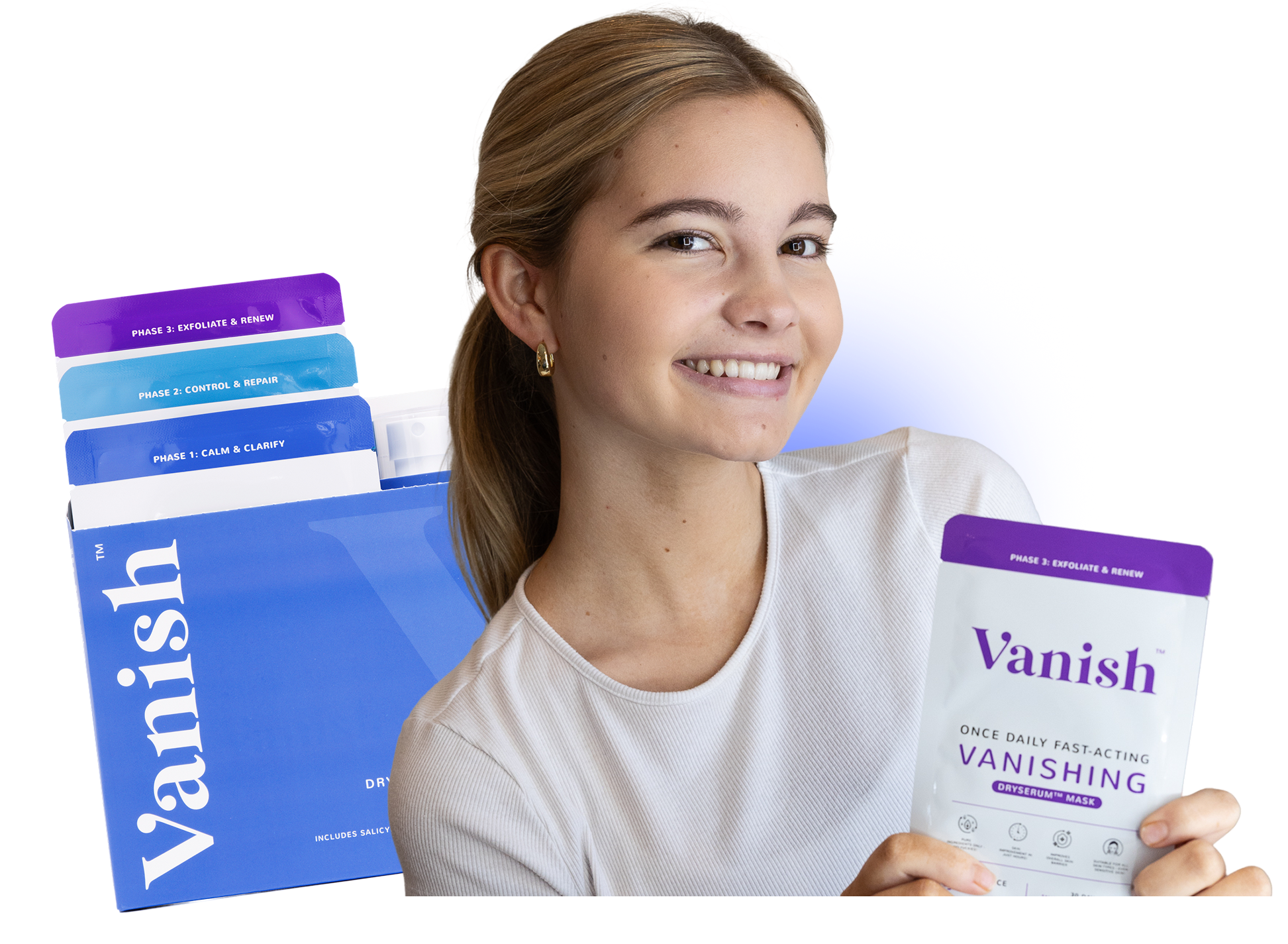 Vanish uses our patented DrySerum™ delivery system that allows ingredients to penetrate DEEPER into the skin to address the root cause of breakouts—without damaging the skin barrier. No water, no fillers, no harsh chemicals that irritate teen skin. Just targeted ingredients delivered in their most effective form, helping teens get clearer, calmer skin safely.