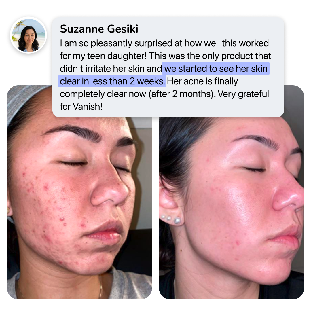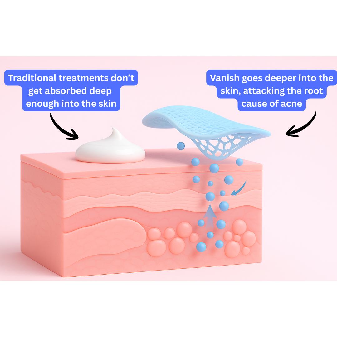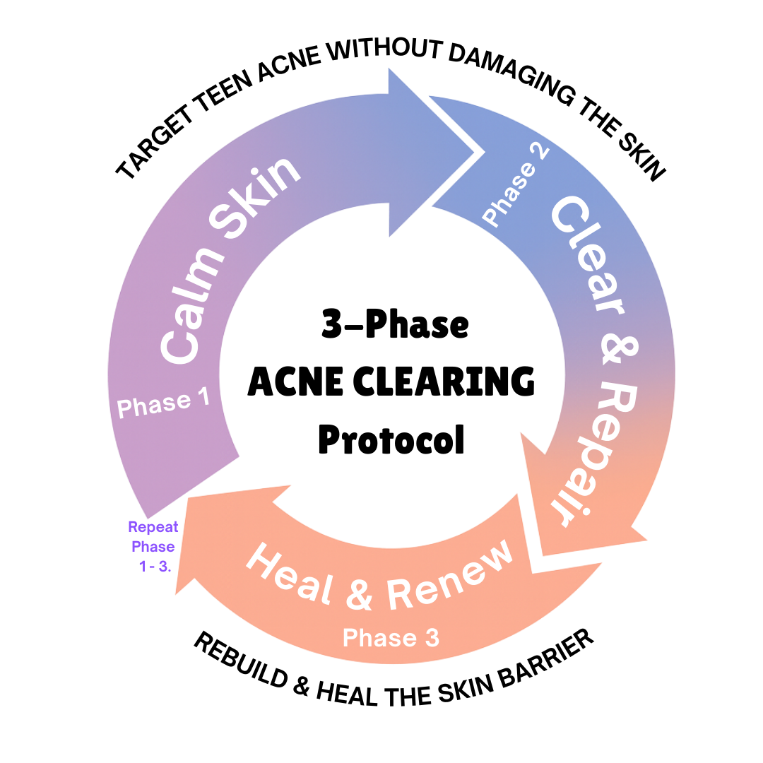 Most creams, gels, serums and spot treatments often sit on top of the skin due to the thick molecule size of these liquid products. Teens have smaller pores which means the treatment doesn't reach the true root cause of teen acne - deep within the skin. This takes longer for the acne to clear and causes teens to apply more of the product, thinking "more is better". This leads to harsh side effects like redness, peeling, purging and irritation.